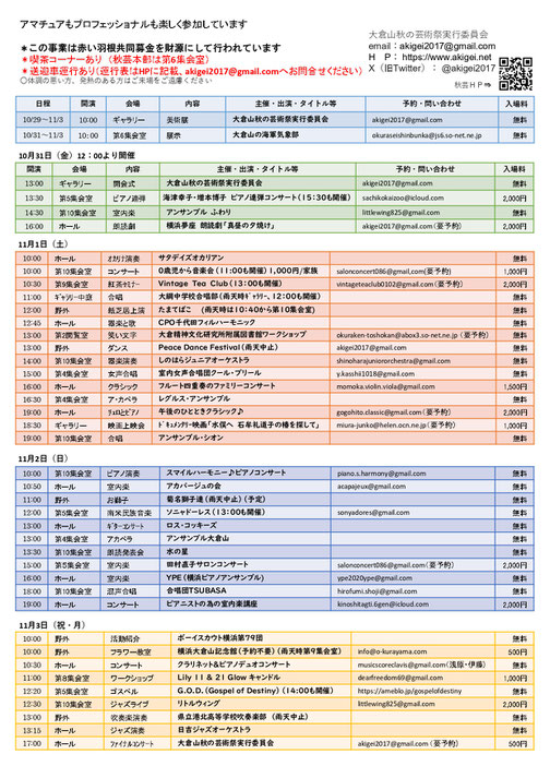 紙版の総合チラシに日程の間違いがあります。10/31(金)「アンサンブル・シオン」は11/1(土)に開催されます。