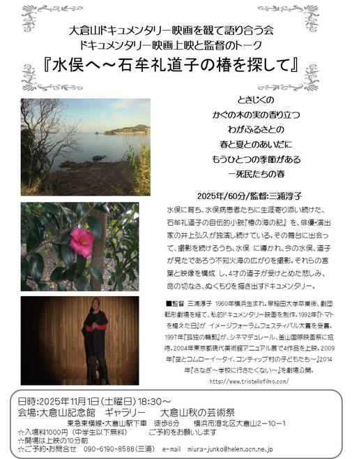 大倉山ドキュメンタリー映画 「水俣へ石牛礼道子の椿を探して」 1000円(要予約) ▶︎お申込はこちら> |